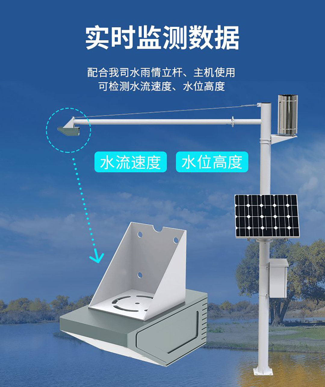 本产品主要应用于灌区的明渠的量水,用作远程测量或检测的数据终端,通常选用在标准 的断面进行测量。本流量计采用高精度的雷达测量水位以及流速,采用CHANNELPRO模型进行量 水的计算,并考虑明渠周围环境影响进行修正。 量水数据由串口数据以标准协议或自有协议输出。